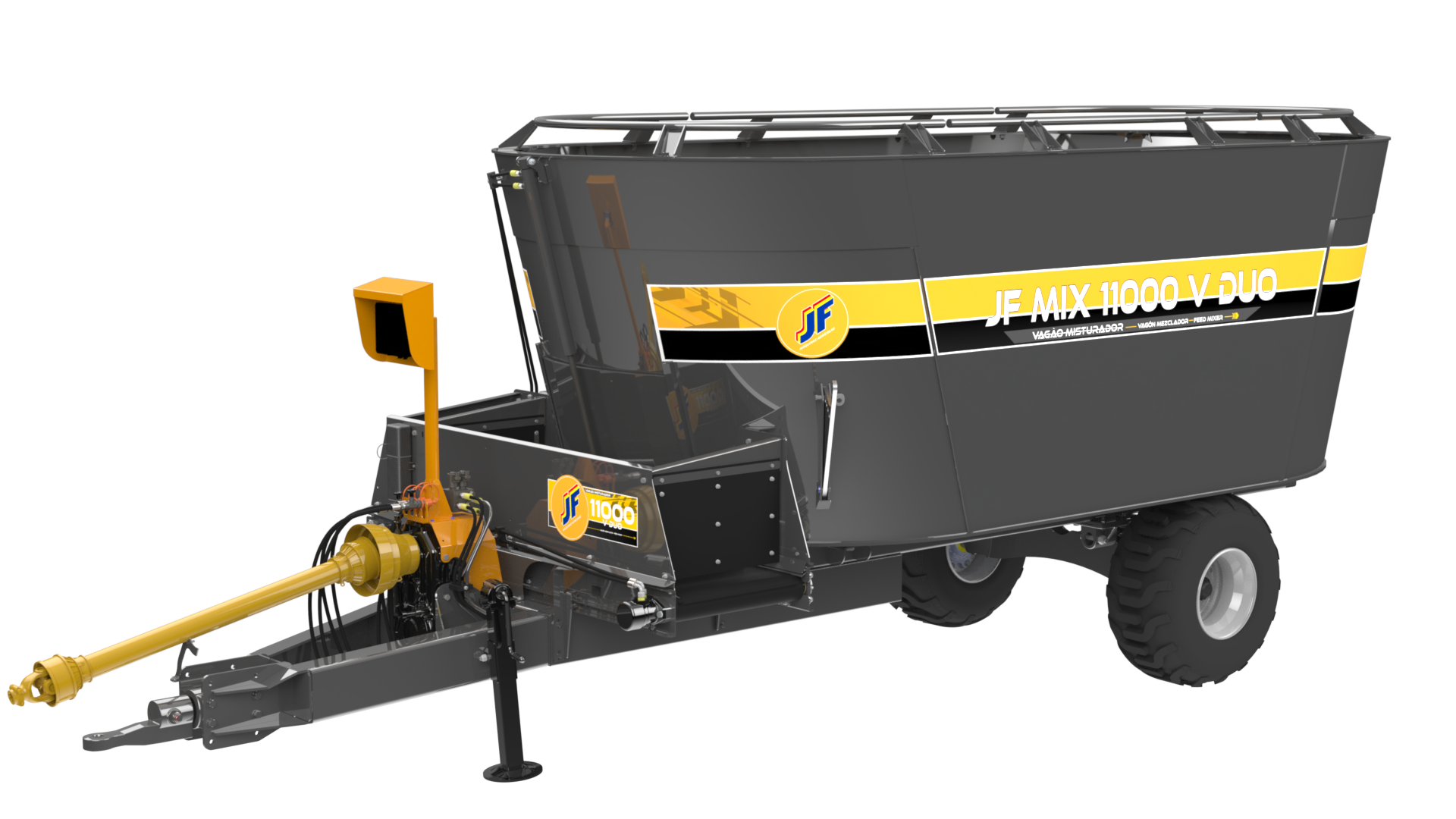 Os Vagões Misturadores JF MIX 7m³ e 11m³ estão disponíveis nas versões V DUO e V DS DUO ( com e sem desensilador), perfeito para quem busca praticidade, qualidade na mistura e eficiência na hora de alimentar seus animais. Com ele, você pode misturar diferentes tipos de alimentos e componentes, garantindo uma dieta balanceada e saudável para o seu rebanho. Vagão composto por um tanque de mistura INOX, chassi independente, duas roscas misturadoras helicoidais verticais com 9 facas reguláveis, duas contrafacas reguláveis, esteira com regulagem de posição acionada por cilindro hidráulico, porta de dosagem com a b e r t u r a h i d r á u l i c a , c o m p a r t i m e n t o p a r a a d i ç ã o d e farináceos/concentrados, arco de feno, transmissão por meio de planetário banhado a óleo, cabeçalho de acoplamento ao trator, sistema de pesagem eletrônico de precisão com balança, células de