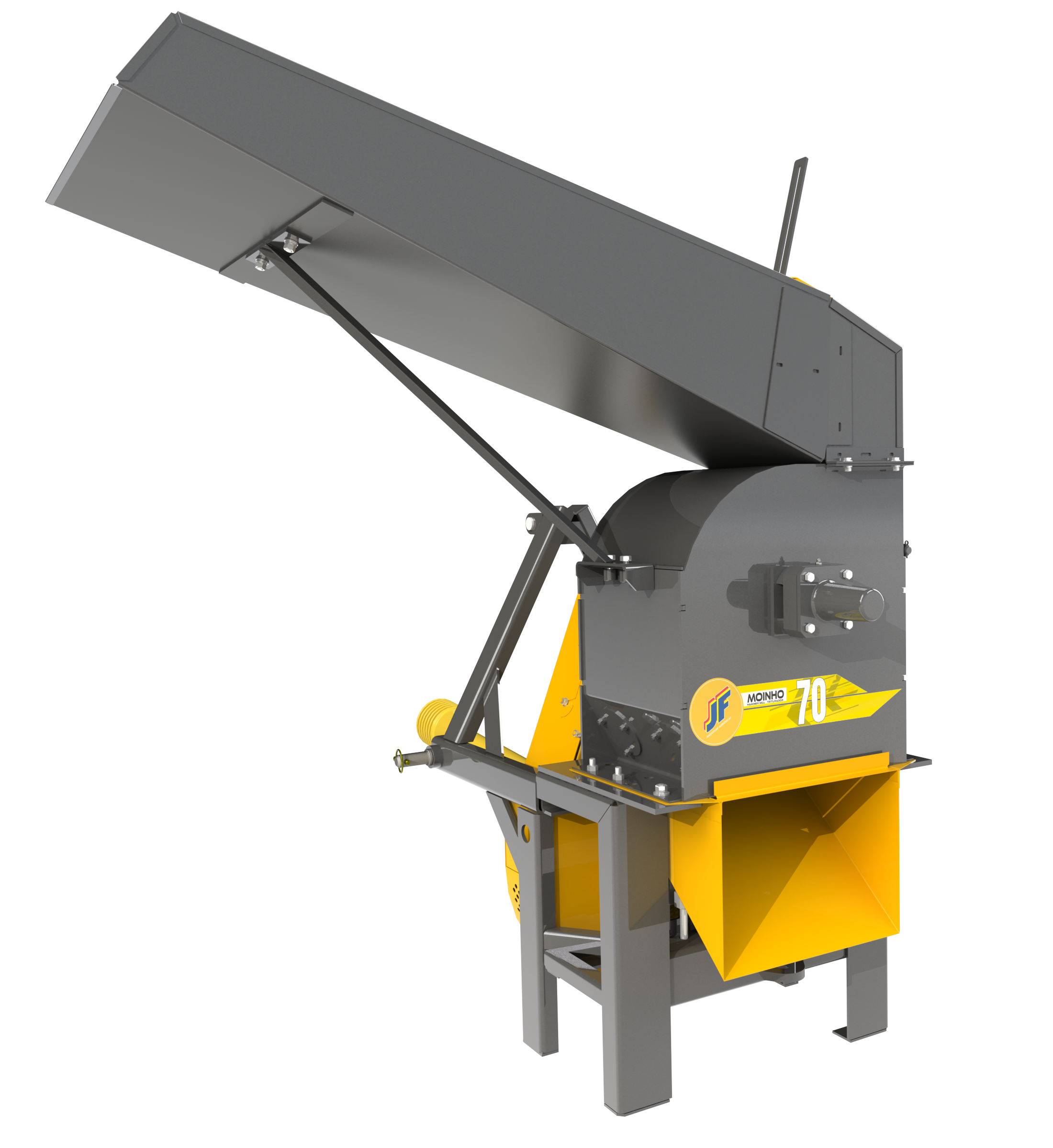 Descritivo técnico: Moinho triturador destinado à trituração de milho em espigas, milho em grãos secos ou úmidos e outros produtos compatíveis, produzindo diferentes granulometrias conforme peneiras de 0,8 mm, 3 mm, 5 mm, 10 mm, 14 mm e 18 mm (Conforme modelo adquirido no momento da compra). Disponível em versões para acionamento por motor elétrico (a partir de 30 cv) ou por trator agrícola, através da tomada de força (30 a 102 cv, conforme modelo). A JF 70 GS tritura milho em espiga ou em grão, cascas, palhas, sementes e muito mais, permite a produção de fubá, mimoso, quirera, rolão fino e rolão grosso, garantindo a granulometria ideal para cada tipo de uso. O modelo JF 70 GU é indicado para milho úmido ou reidratado, com teor de umidade entre 20% e 35%. O modelo JF 70 R possui sistema de reidratação para aplicação homogênea de água ao milho triturado, obtendo a umidade adequada para silagem.