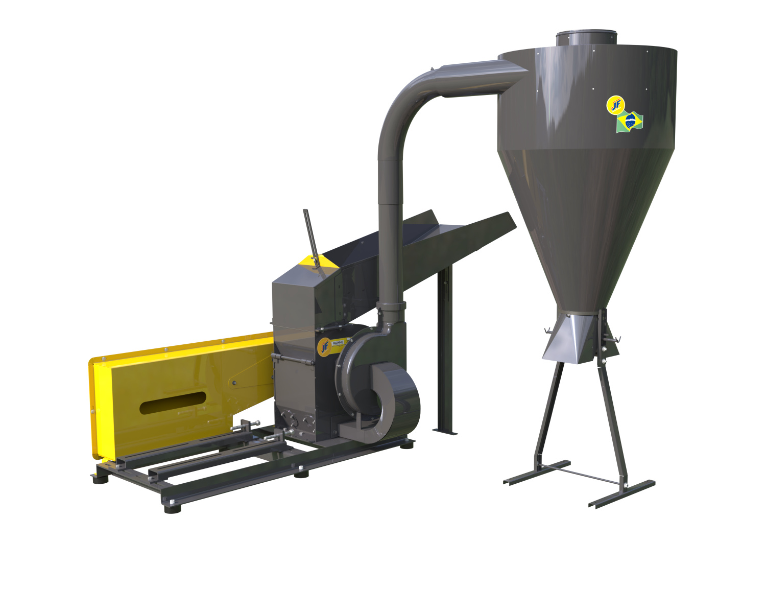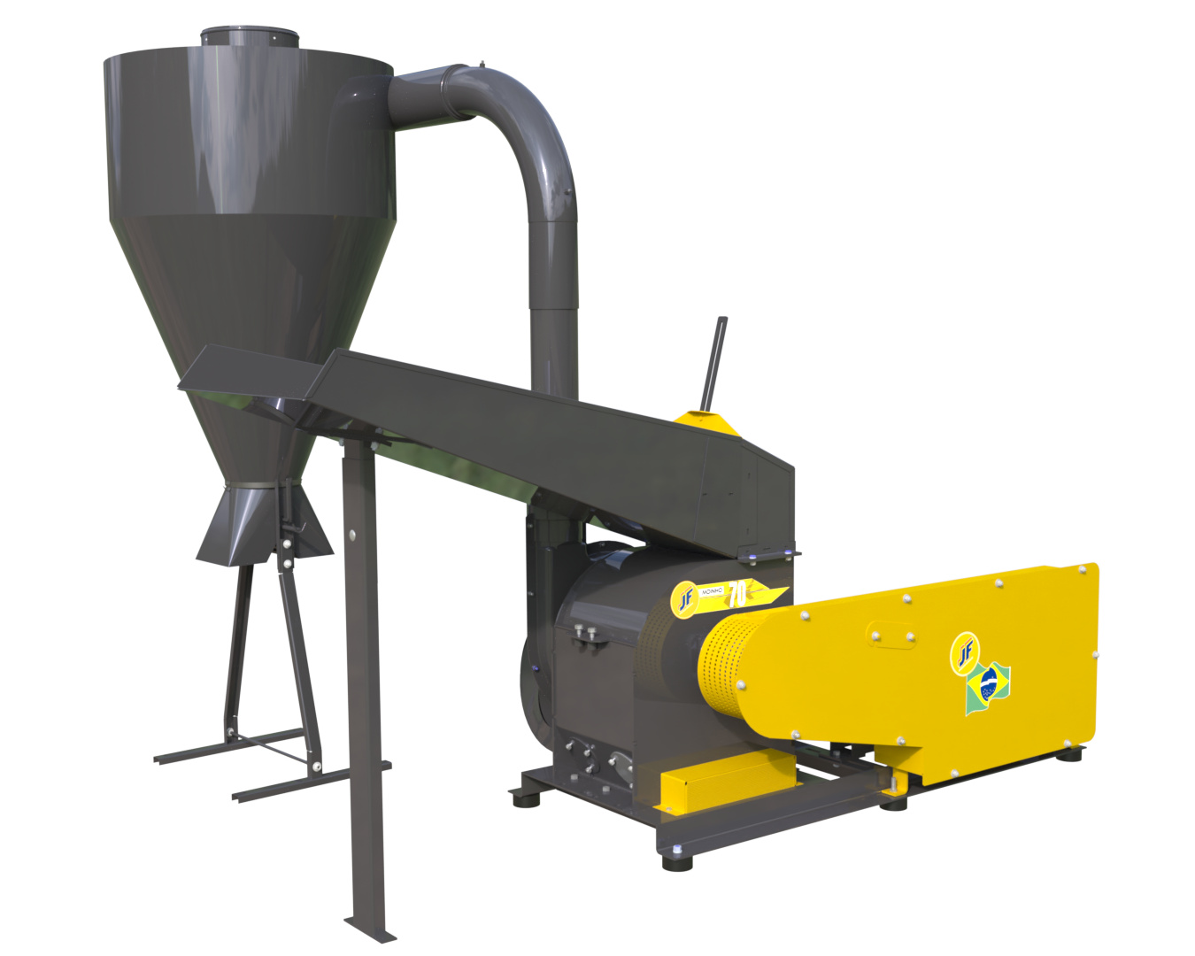 JF 70 GS - Moinho para Grãos Secos: Praticidade e versatilidade na moagem de produtos secos. A JF 70 GS tritura milho em espiga ou em grão, cascas, palhas, sementes e muito mais, adaptando-se facilmente às necessidades da propriedade. Equipada com 4 peneiras, com furos de 0,8 mm, 3 mm, 5 mm e 10 mm, permite a produção de fubá, mimoso, quirera, rolão fino e rolão grosso, garantindo a granulometria ideal para cada tipo de uso. Conta também com ciclone opcional, que facilita o ensacamento do produto moído, tornando o processo mais ágil e eficiente.