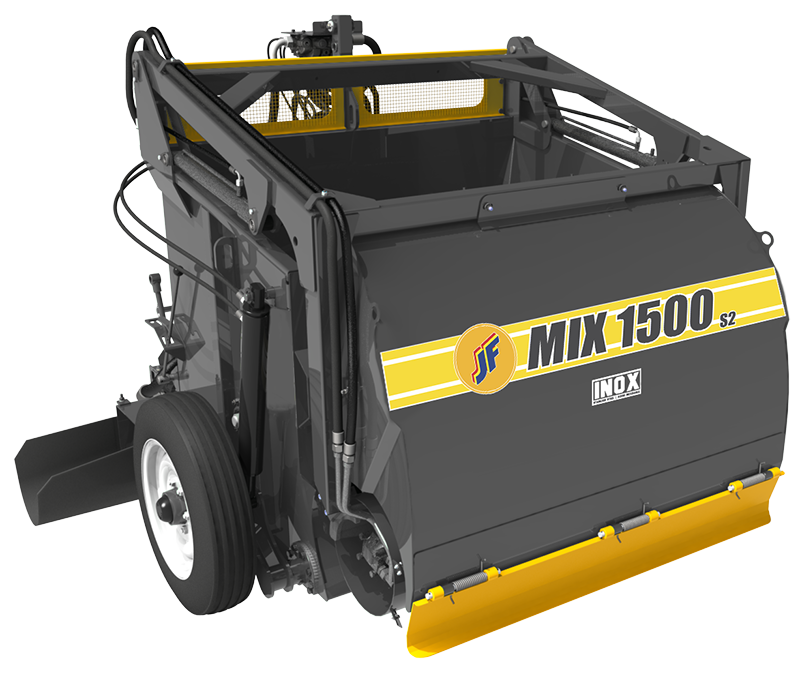 Totalmente redimensionando, o JF Mix 1500 S2 é total INOX 5mm, possui operação simples com controle e acionamento do desensilador, rosca lateral, misturador e descarga no cocho através de comando hidráulico, direto da cabine do trator.