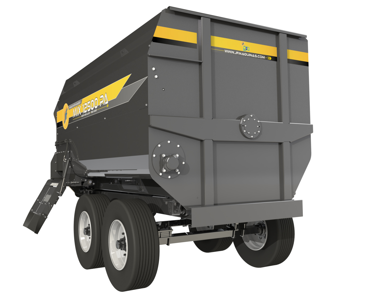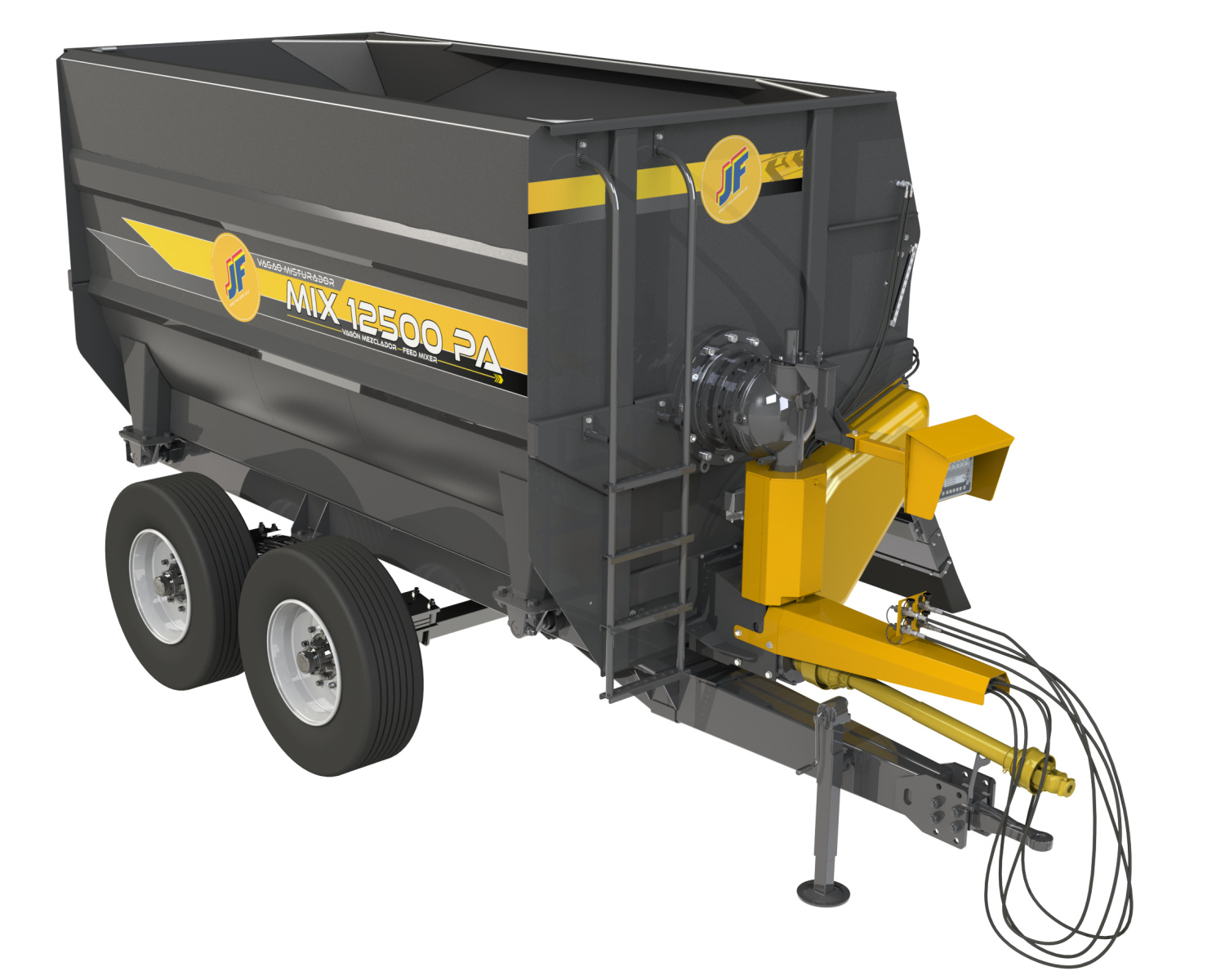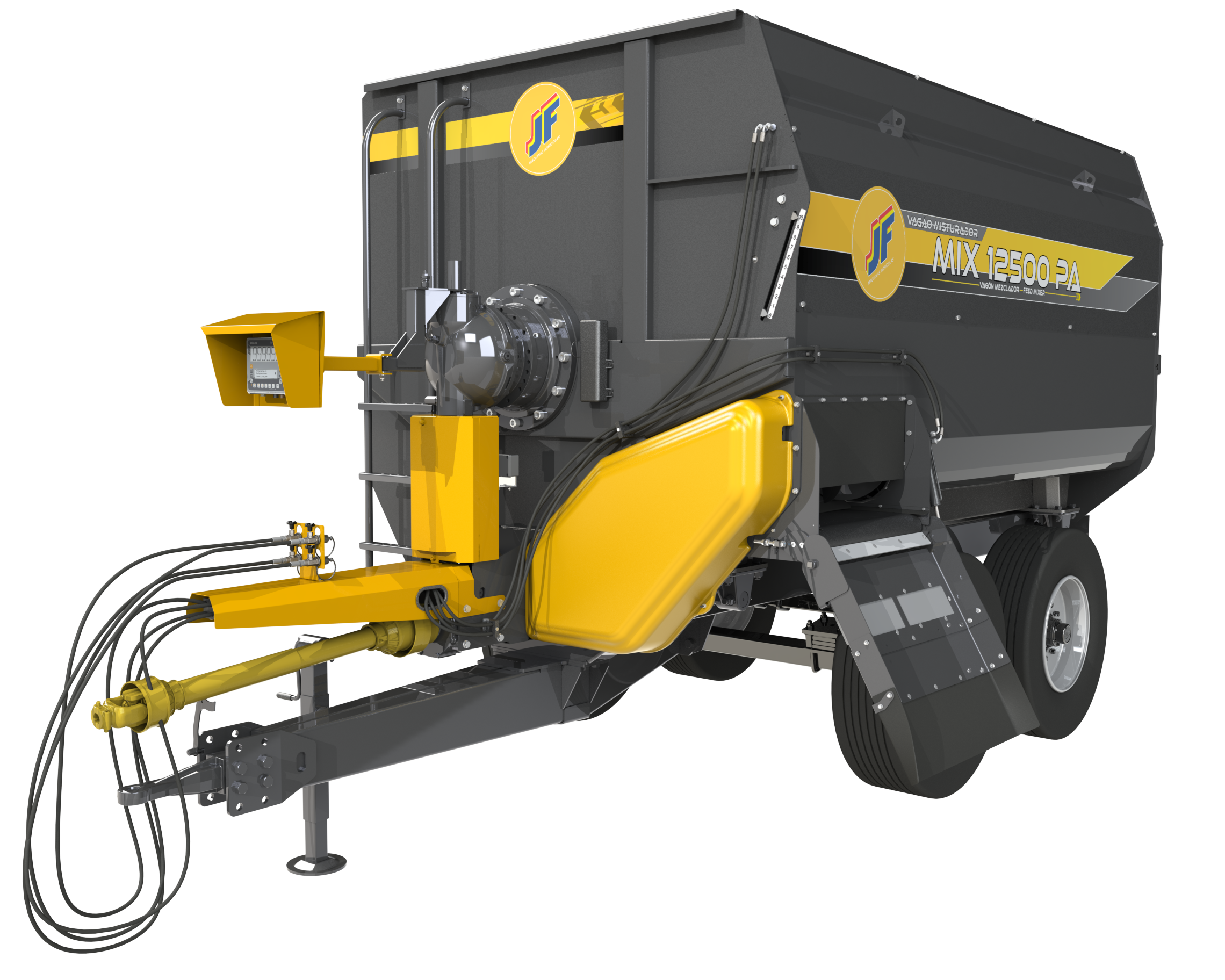 O Vagão Misturador JF Mix 8500/12500 PA é acoplado à barra de tração do trator e acionado por intermédio da tomada de força (540 rpm). Possui sistema de mistura que representa um novo conceito. Formado por rotor e pás misturadoras posicionadas para obter uma mistura mais uniforme e aerada, preservando as