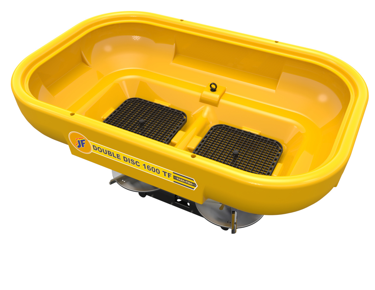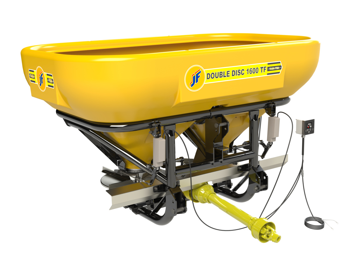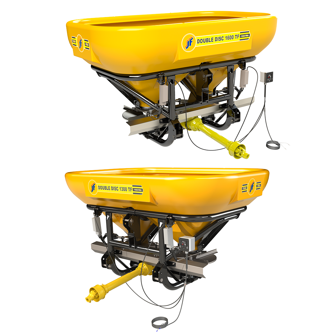 O JF DOUBLE DISC 1300 TF / 1600 TF é um distribuidor duplo disco para distribuição a lanço, com alcance de 16 a 36m, a regulagem no ângulo das pás possibilita uma melhor uniformidade na distribuição e permite também o trabalho em pequenas áreas devido ao sistema de lançamento independente (com apenas um disco), facilitando o trabalho e evitando o desperdício quando há necessidade nas aplicações de bordas.
